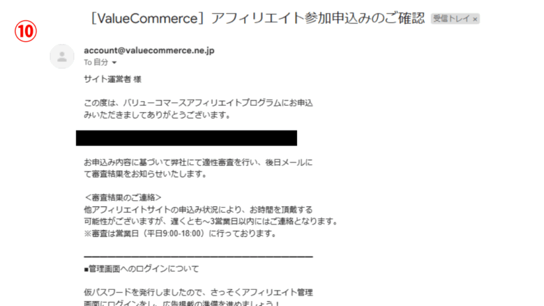 ⑩バリューコマースから「アフィリエイト参加申込みのご確認」メールが届くので内容を確認します。